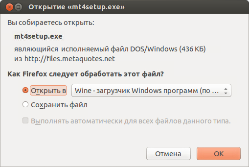 Для установки терминала скачайте установщик mt4setup.exe. По завершении загрузки запустите установочный файл. Система автоматически распознает, что вы пытаетесь запустить файл, предназначенный для системы Microsoft Windows, и предложит открыть его при помощи Wine. Выберите этот вариант и нажмите ОК.
